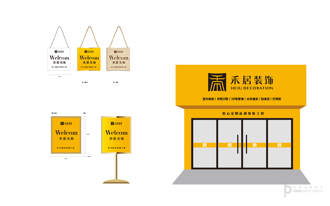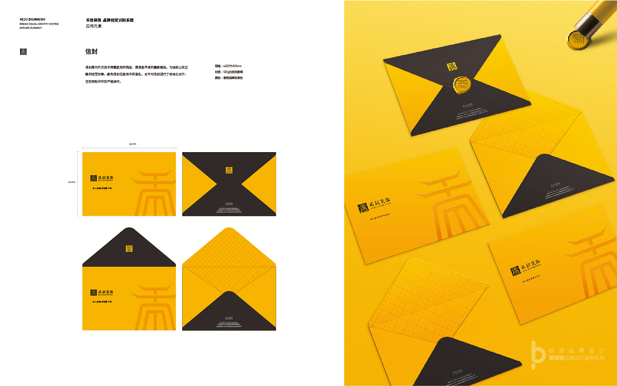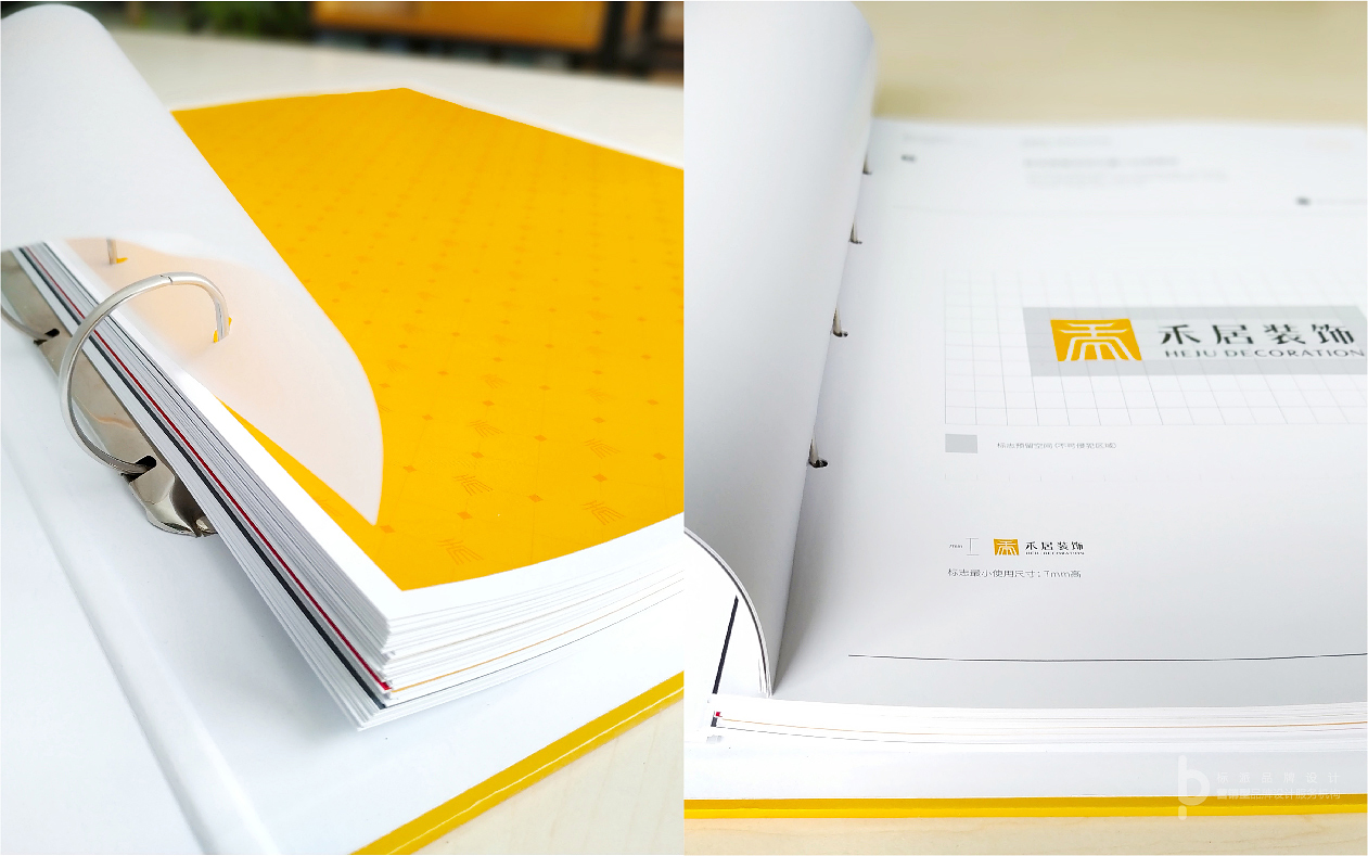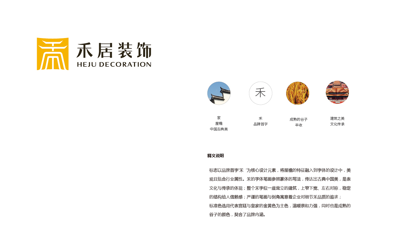 標志以品牌首字‘禾 ’為核心設計元素,將屋檐的特征融入到字體的設計中,美觀且貼合行業屬性。禾的字體筆畫參照篆體的寫法,傳達出古典中國美,是表文化與傳承的體現;整個禾字似一座聳立的建筑,上窄下寬、左右對稱,穩定的結構給人信賴感;嚴謹的筆畫與倒角寓意著企業對細節禾品質的追求;