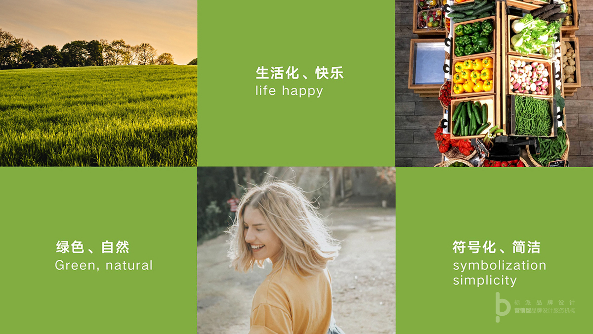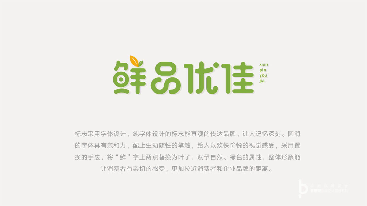 標(biāo)志采用字體設(shè)計(jì),純字體設(shè)計(jì)的標(biāo)志能直觀的傳達(dá)品牌,讓人記憶深刻,圓潤(rùn)的字體具有親和力,配上生動(dòng)隨性的筆觸,經(jīng)人以歡快愉悅的視覺(jué)感受,采用置換的手法,將“鮮”字上的兩點(diǎn)替換成葉子,賦予自然,綠色的屬性,整體形象能讓消費(fèi)者有親切的感受,更加拉近消費(fèi)者和企業(yè)品牌的距離。